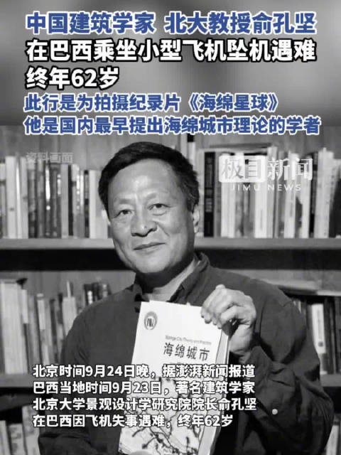 9月24日,北京大学建筑与景观设计学院发布讣告:北京大学建筑与景观设计学院创院院长、景观设计教育家俞孔坚,于当地时间2025年9月23日在巴西潘塔纳尔地区开展生态考察期间,因飞机失事不幸罹难,享年62岁。另有公开消息称,事故中失事的飞机是塞斯纳175飞机,制造于1958年,失事前该飞机的机龄已达67年。25日,有航空业内人士告诉极目新闻记者,67年机龄在国外并不少见,包括该机型发动机有设计缺陷、飞机无夜航能力,以及农场不具备夜间降落条件等多个违规因素造成了此次事故。