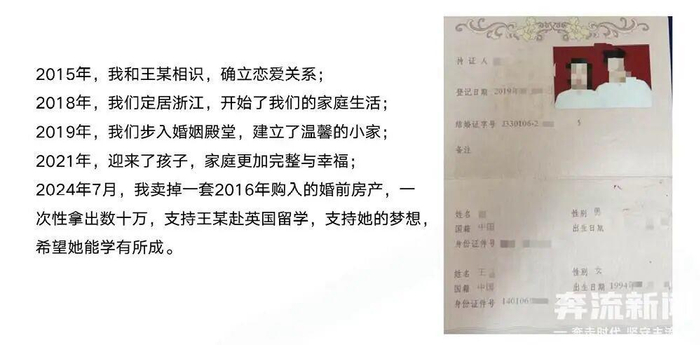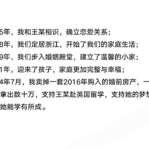 9月25日,记者联系到网名为“守护孩子和尊严的父亲”的张先生。他告诉记者,自己家住浙江杭州,今年36岁。“目前正考虑是否要离婚。当年卖掉房子后拿出60万元让妻子王某出国留学,没想到最后换来这样的结果,博士生黄某兴在道德层面根本没资格被公派留学。”