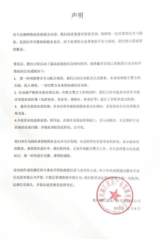 12月8日,重庆融汇温泉产业发展有限公司就网传“大量女宾疑遭偷拍”发布声明称,对于近期网络流传的相关内容,公司高度重视并深表关切。事发后公司立即启动了最高级别的应急响应程序,商家已向公安机关正式报案,已针对温泉内所有可能涉及隐私的区域(包括客房、更衣室、淋浴区、休息区等)进行了多轮穿透式检测。截至目前,在本次所有被检的隐私重点区域内,未发现存在任何图像采集设备。