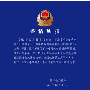 2025年12月23日16时许,彭泽县定山镇响水村乡村道路发生一起车辆落水单方事故。接到报警后,公安、消防、医疗等部门赶赴现场开展救援。经查,罗某某(女,49岁,彭泽县人)驾车行驶至事发路段时坠入路边池塘,造成包括罗某某等车内8人死亡。目前,事故调查、善后处置等工作正在进行中。