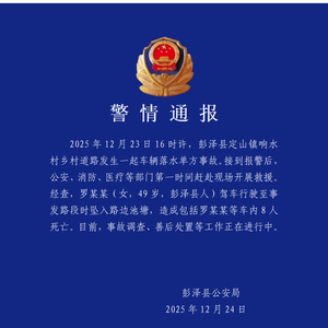 2025年12月23日16时许,彭泽县定山镇响水村乡村道路发生一起车辆落水单方事故。接到报警后,公安、消防、医疗等部门第一时间赶赴现场开展救援。经查,罗某某(女,49岁,彭泽县人)驾车行驶至事发路段时坠入路边池塘,造成包括罗某某等车内8人死亡。目前,事故调查、善后处置等工作正在进行中。
