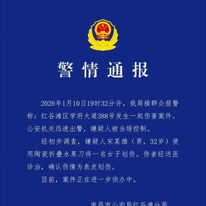 2026年1月10日19时32分许,我局接群众报警称:红谷滩区学府大道388号发生一起伤害案件。公安机关迅速出警,嫌疑人被当场控制。