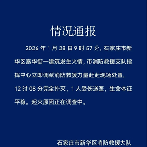 央视网消息:据石家庄新华发布微信公众号消息,1月28日,河北石家庄市新华区消防救援大队发布情况通报。1月28日9时57分,石家庄市新华区泰华街一建筑发生火情。石家庄市消防救援支队指挥中心立即调派消防救援力量赶赴现场处置,12时08分完全扑灭,1人受伤送医,生命体征平稳。起火原因正在调查中。