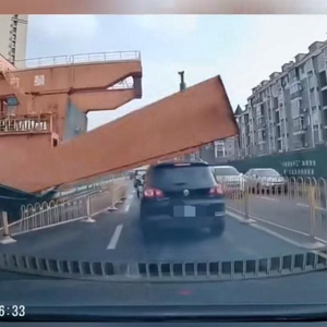 2月1日上午,网友发布了一段行车记录仪拍摄的视频:车辆正常行驶中,左侧有工地,行驶了一段后,车道突然变窄,一辆白车刚经过,空中有大的类似于机械手臂的物件落下来,砸中白色车辆,把后面的黑色车辆给挡住了。