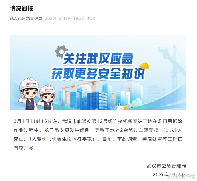 2月1日11时16分许,武汉市轨道交通12号线连接线新春站工地在龙门吊拆除作业过程中,龙门吊支腿发生倾倒,导致工地外2台路过车辆受损,造成1人死亡、1人受伤(伤者生命体征平稳)。目前,事故调查、善后处置等工作正有序开展。 (武汉市应急管理局微信公号)