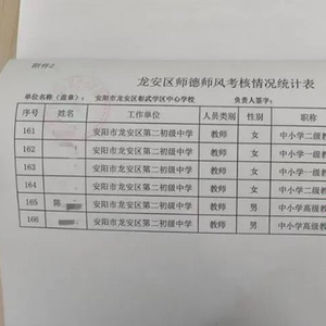 陈先生提供的龙安区彰武学区中心学校于2024年7月出具的师德师风考核情况统计表显示,陈先生的工作单位为龙安区第二初级中学,考核结果为不合格。