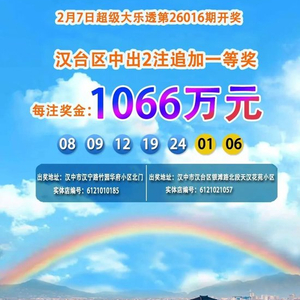 2026年2月7日超级大乐透第26016期开奖,陕西汉中中出2注一等奖,基本投注每注奖金5925957元;追加一等奖,每注奖金4740766元,合计当期一等奖奖金1066万元。据陕西体彩,这2个大乐透一等奖为一人所得。