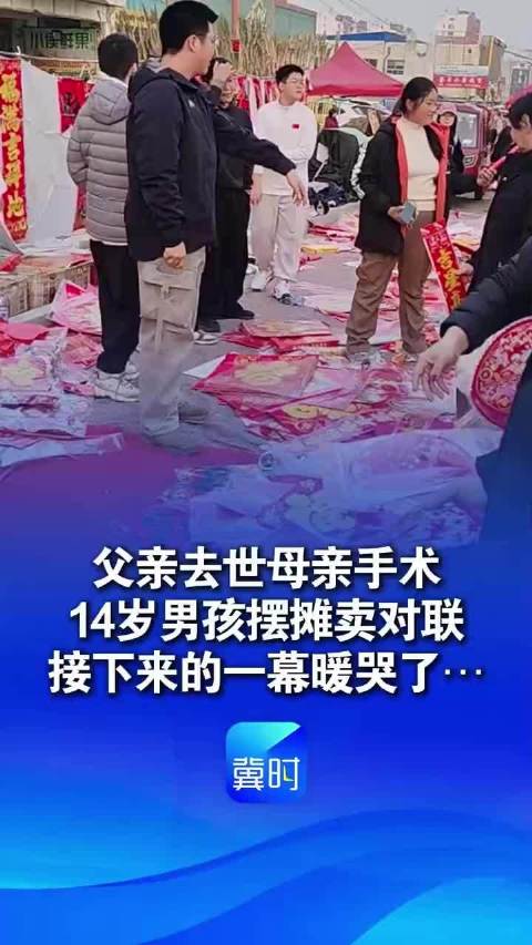 近日,山东招远,14岁男孩父亲去世、母亲刚做完手术,街头摆摊卖对联和福字,同学现场帮忙、市民纷纷购买。