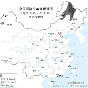 预计2月21日14时至2月22日14时,内蒙古东北部、黑龙江西部、吉林西部、新疆北疆西部等地部分地区有大雪,其中,内蒙古东北部、黑龙江西北部等地部分地区有暴雪(10~18毫米)。上述部分地区新增积雪深度6~10厘米,局地可达15厘米以上。