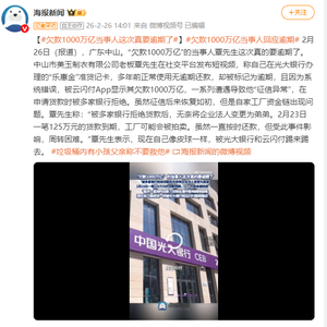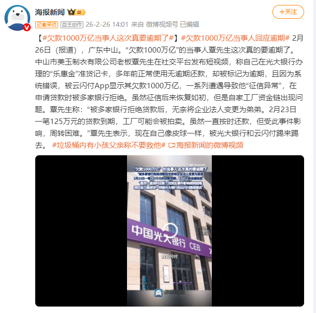 [欠款1000万亿当事人这次真要逾期了]2月26日(报道),广东中山。“欠款1000万亿”的当事人覃先生这次真的要逾期了。中山市美玉制衣有限公司老板覃先生在社交平台发布短视频,称自己在光大银行办理的“乐惠金”准贷记卡,多年前正常使用无逾期还款,却被标记为逾期,且因为系统错误,被云闪付App显示其欠款1000万亿,一系列遭遇导致他“征信异常”,在申请贷款时被多家银行拒绝。虽然征信后来恢复如初,但是自家工厂资金链出现问题。覃先生称:“被多家银行拒绝贷款后,无奈将企业法人变更为弟弟。2月23日一笔125万元的贷款到期,工厂可能会被拍卖。虽然一直按时还款,但受此事件影响,周转困难。”覃先生表示,现在自己像皮球一样,被光大银行和云闪付踢来踢去。