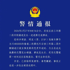 2026年2月27日8时56分许,武侯区西三环路二段外侧辅道发生一起道路交通事故。