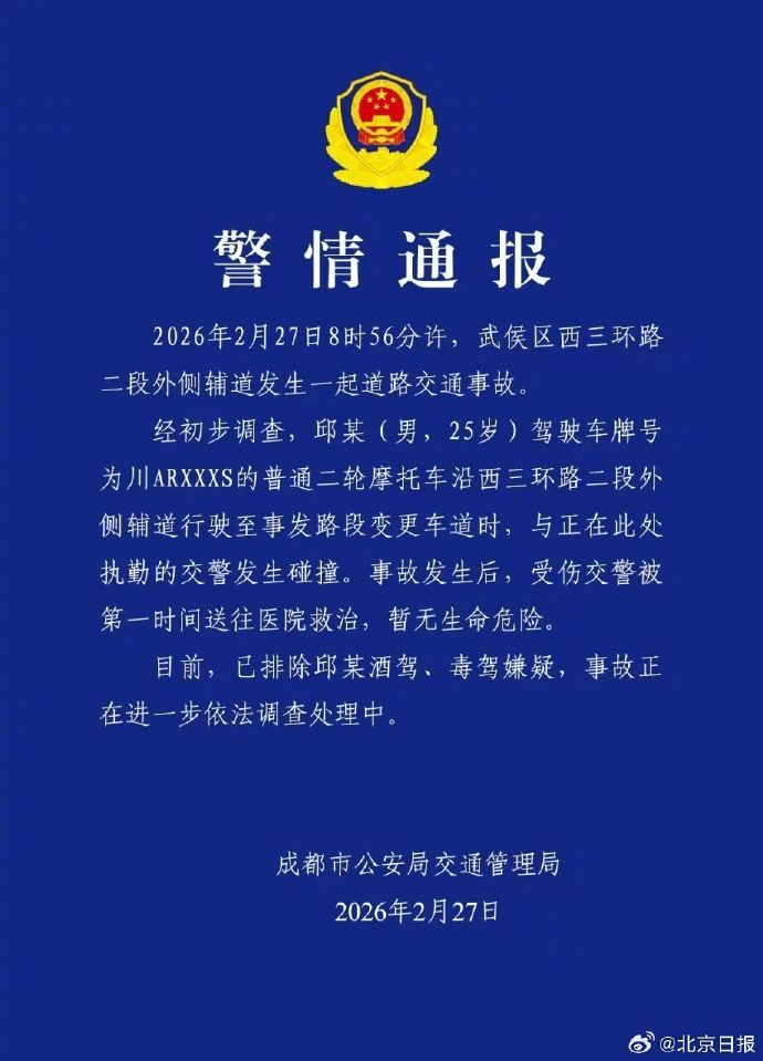 经初步调查,邱某(男,25岁)驾驶车牌号为川ARXXXS的普通二轮摩托车沿西三环路二段外侧辅道行驶至事发路段变更车道时,与正在此处执勤的交警发生碰撞。事故发生后,受伤交警被第一时间送往医院救治,暂无生命危险。