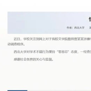 今晨,西北大学发布情况通报表示,近日学校关注到网上对于该校文学院教师贾某某涉嫌学术论文抄袭等问题的相关反映,学校高度重视,已成立工作专班,启动调查程序。