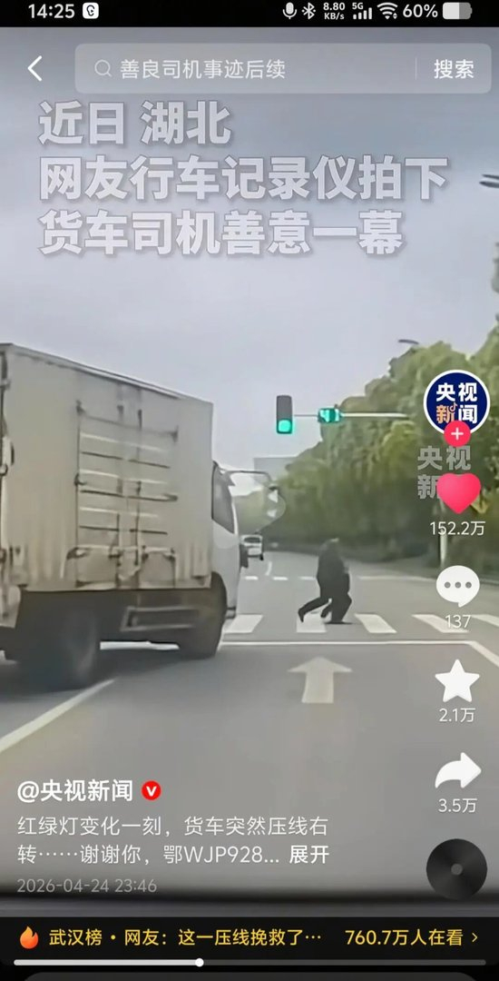 4月24日深夜23:46,央视新闻抖音号转发该视频,并配文《红绿灯变化一刻,货车突然压线右转……谢谢你,鄂WJP928》。截至25日13时,点赞量已超过152万。一场全网寻找“鄂WJP928”的行动温情展开。