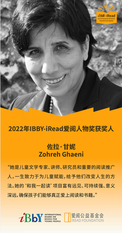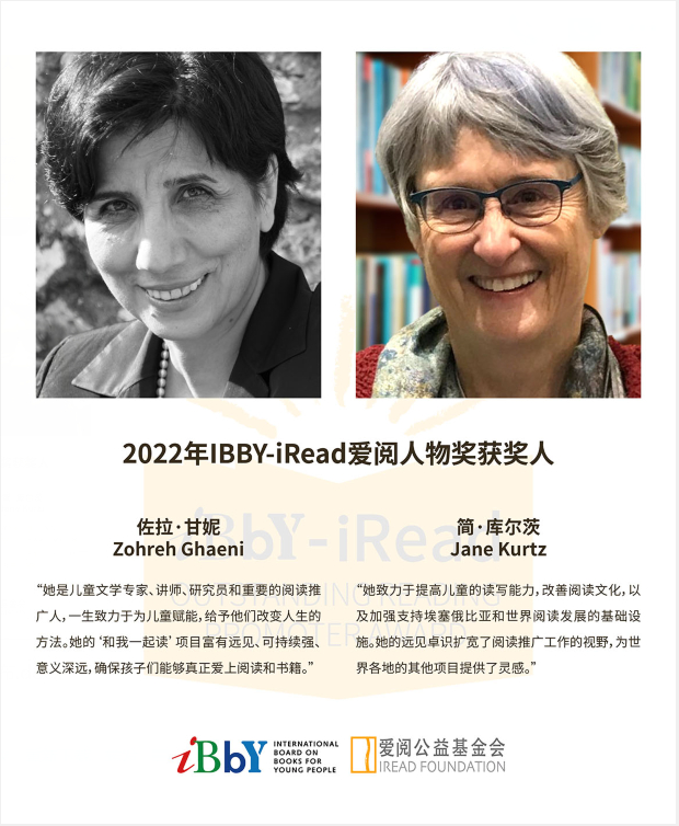 IBBY-iRead爱阅人物奖的两位获奖人分别为来自伊朗的佐拉·甘妮(Zohreh Ghaeni)和来自美国的简·库尔茨(Jane Kurtz)。每名获奖者将获得奖金20万元人民币。同时,奖项还为每位获奖人指定的非营利儿童阅读推广项目捐赠15万人民币用以支持项目发展。