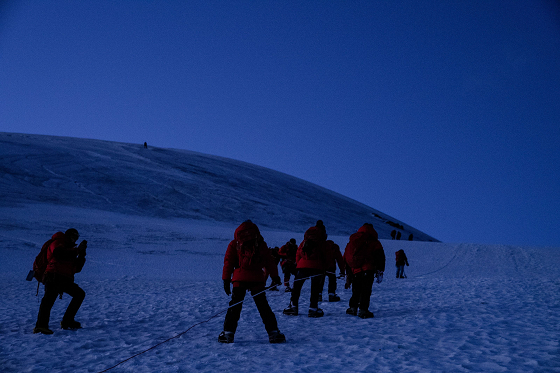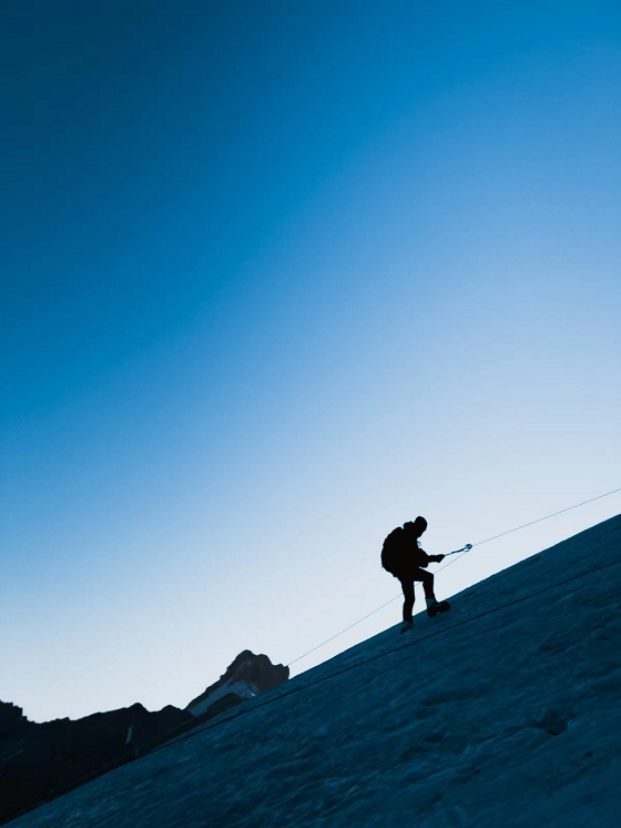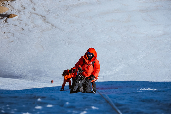 在洛堆峰冰坡的尽头,队员们艰难而拼尽全力地抬起冰爪,用力再向前多迈一步。这时深蓝色的天空露出浅橘色,勾勒出连绵群山的线条。韩子君回头对身后的队员说:“你看天边!我们为什么历尽千辛万苦来到这里,不就是为了这一刻吗。”