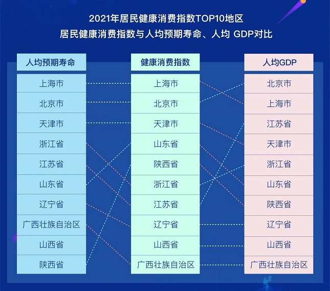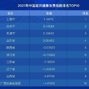 报告显示,2021年度居民健康消费指数排名,上海、北京、天津在31个省(直辖市、自治区)中位居前三,山东、陕西、浙江、江苏、辽宁、山西、广西等地分列第四至第十位。
