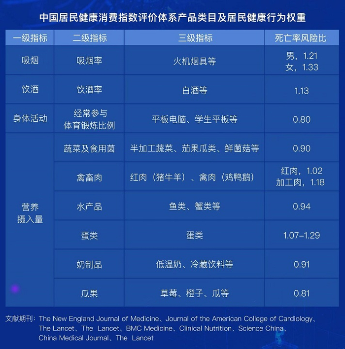 居民健康消费指数旨在使用消费大数据衡量居民消费习惯对健康程度的影响。通过计算居民平均每日消耗蔬菜水果、肉蛋奶、烟酒等商品以及身体活动时间的具体数值,参考权威医学实证研究得出居民消费行为对于健康的影响系数,进而推算得来。