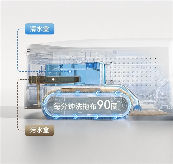 在拖布实时自清洁方面,晓舞创新性的把污水盒安装到机身内。工作时机器会将清水先喷到地面溶解脏污,并通过拖布旋转卷起脏污,脏污随后会被实时回收到机身污水盒内,从而让拖布一直保持干净的状态拖地,有效解决目前市面上扫拖机器人拖布带着脏污满屋跑,造成二次污染的痛点。