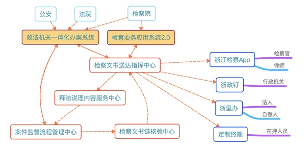 因此,基于这样的理解,我们设计了检察文书送达指挥中心,实现文书数据对接、送达链路管理、送达地址服务、送达融合服务以及送达流程监控;设计了释法说理内容服务中心,实现典型案例库建设、线上法律援助团队建设、普法短视频制作以及特殊案件专人服务制度建设;设计了案件监督流程管理中心,实现业务流数据对接、检察案件监督码建设;设计了检察文书链核验中心,实现检察文书区块链建设、检察文书内容核验以及检察历史文书检索展示。