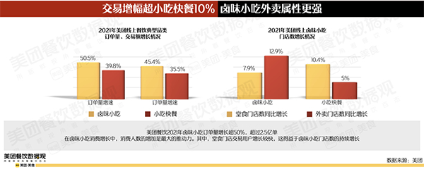 在销售上,美团餐饮2021年卤味小吃订单量从1.8亿单增长到2.7亿单,增幅超50%。且订单量和交易总额都超整体小吃快餐10%。