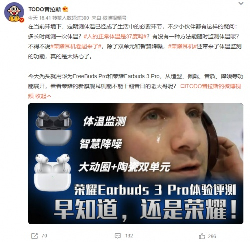 比如科技博主@白泽科技表示,荣耀Earbuds 3 Pro听歌时就能测温,这种在音频设备中加入健康监测功能的产品,是值得推广和借鉴的。数码博主@TODO普拉斯对荣耀Earbuds 3 Pro加入了贴心的体温监测功能给予认可,再加上其双单元和智慧降噪,荣耀耳机这次真的卷起来了!