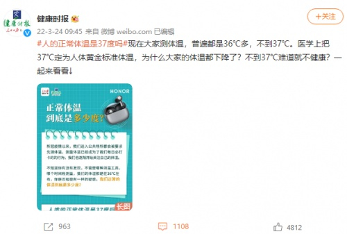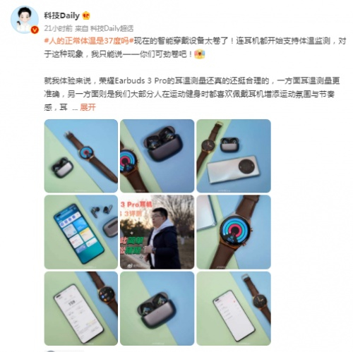 在#人的正常体温是37度吗#话题下,各领域知名博主也纷纷发声,围绕健康方向说测温与人体健康的重要意义进行了讨论,传递了耳温测量更准确的事实,同时对荣耀Earbuds 3 Pro带来的零打扰、零负担、零感操作的体温监测体验给予了肯定。