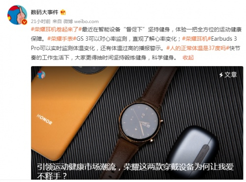 依靠智能穿戴设备进行全方位运动健身,数码博主@数码大事件结合自己的健身体验来说道,“在智能设备‘督促下’坚持健身,体验一把全方位的运动健康保障。荣耀手表GS 3可以对心率监测,直观了解心率变化;荣耀耳机Earbuds 3 Pro可以实时监测体温变化,还有体温过高的播报警示。快节奏的工作生活下,大家更得抽时间坚持锻炼健身,科学健身。”