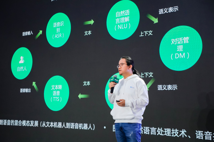 (视频)其实大家可以看到在混合语音和文本多模态交互场景当中,我们产生了多维态的信息Feature和能力之间更加复杂的问题,就像人和人打电话的时候,我们通常有“嗯嗯”“啊啊”的转折承接,因此所产生的技术问题,衍生了在过去十年当中我们讲到的智能人机交互发展的整个链路,它包含从自然人通过语音识别技术,到我们称之为自然语言理解,到对话系统的建设,以及到自然语言生成板块,以及到最后TTS文本输出。而在这条链路过去十年发展当中,都是围绕两个技术:一个是NLP的自然语言处理技术,以及语音识别技术和TTS技术能力的混合发展。