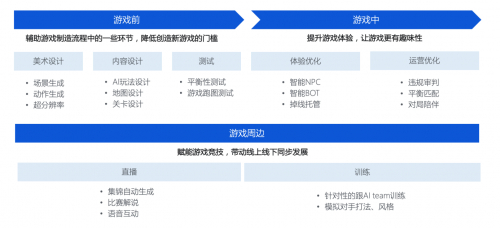 AI技术在游戏全链路的研究与应用包含两部分,在横向上覆盖游戏制作、运营及周边生态全生命周期,提升游戏品质,丰富玩家体验;在纵向上AI正拓展更多元的游戏品类。在去年GDC大会上,腾讯AI Lab就展示了AI在不同类型游戏上的应用成果,包括提高游戏开发效率、打造新玩法、辅助游戏平衡性测试等案例经验。