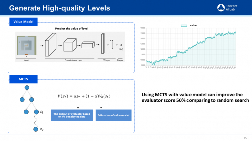 第二步,在可玩的基础上,AI要提升关卡的质量,高质量的关卡是指符合游戏设计规范、美学、乐趣等,更重要的是需要和种子关卡的游戏体验是一致的。我们可以通过AI bot跑图模拟对局结果,可以获取体验相关的特征,例如:每帧的承伤、子弹位置等,然后基于种子关卡和少量人类标注数据训练评估器模型。最后结合MCTS算法和评估器模型进行搜索,相比随机搜索,MCTS生成的关卡的评估得分提升约50%。