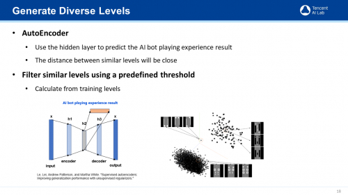 最后,重复相似的关卡会直接影响玩家的体验,因此AI还要能识别并去除相似的关卡。我们采用的是无监督训练模型自编码器,该方法不需要依赖有标注的数据,在自编码器的基础上,我们加入了AI bot跑图的语义信息作为监督信号,让自编码器的隐层去预测跑图结果,这样可以使得关卡编码向量除了刻画关卡的视觉信息之外,还可以刻画游戏体验的语义信息。最后通过自编码器学习到的关卡编码向量进行相似度计算,从而过滤掉相似的关卡。