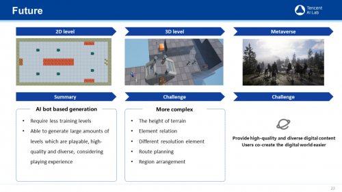 相比之下,AI生成3D关卡内容则要复杂得多,3D关卡涉及地形起伏、元素之间的关联、不同分辨率的元素、路线与区域规划等,更考验AI的生成能力。目前腾讯AI Lab已在约200个训练关卡的基础上,结合人类的标注编辑,生成了超过一万个3D关卡,并在持续探索AI在3D领域的多种内容生成能力。