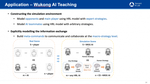 实现人机“同频”之后,接下来是沟通和协作的问题。首先我们用基于专家策略的AI模型模拟玩家,再使用各种不同策略的AI模型分别模拟对手和队友,从而搭建起一个高度仿真的人机协作的环境。然后,我们在宏观策略层面建模了信息交流,通过构建通用的通信协议“元指令”来描述战略意图,实现AI与玩家的交流。