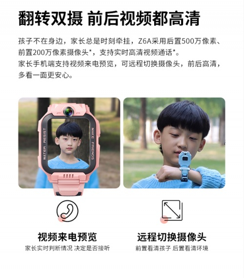 此外,小天才电话手表Z6A搭载了翻转双摄。在视频通话时,可以同时开启前后摄像头,家长不仅能看到孩子的样子,还能看到孩子所处的环境,从而精准锁定孩子的位置,如在大型商场和游乐园里找孩子,超级方便。小天才电话手表Z6A达到IPX8游泳级防水,通过定制防水元器件和特殊防水技术,让孩子们可以轻松戴着游泳使用。