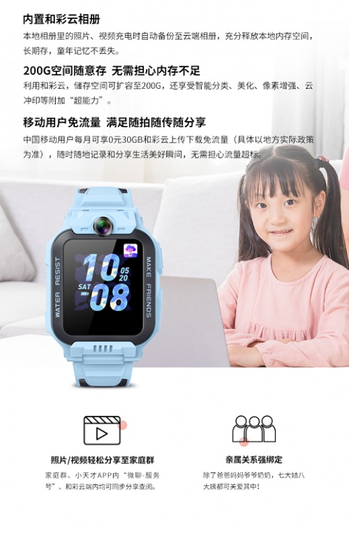 和彩云网盘是中国移动旗下的网盘产品,此次联合小天才升级推出电话手表Z6A,有效提升电话手表的存储空间,孩子可以尽情使用手表的拍照和视频功能。同时Z6A还内置了和彩云相册,能够释放本地存储空间,手表里的照片、视频都可以在充电的时候实时进行备份,和彩云网盘还能帮照片智能分类、美化、图像增强和实现云冲印等附加功能,孩子可以更加随心所欲地记录日常。中国移动用户还可以享有每个月30G的定向免流量上传,不用担心流量超标,方便家长也方便孩子。更重要的是,照片/视频可分享至家庭群,宝贝拍摄全家知晓!除了家庭群,在小天才APP内“微聊-服务号”或和彩云端内亦可同步分享查阅。 除了爸爸妈妈爷爷奶奶,七大姑八大姨都可享受亲子之间的美好记忆。