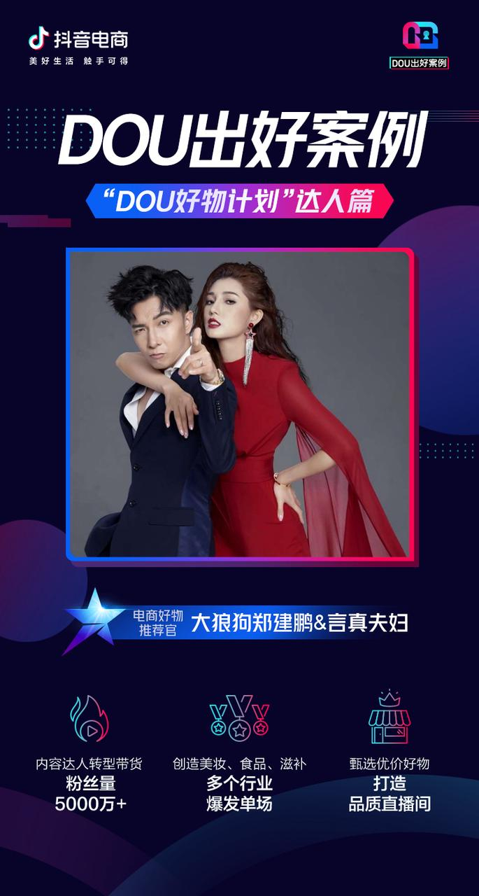与贾乃亮一同在“DOU好物计划”中获封“电商好物推荐官”的,还有抖音电商的知名带货达人——大狼狗郑建鹏&言真夫妇。