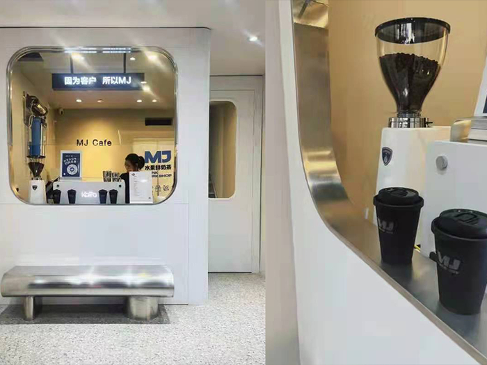 不仅如此,MJ也很懂得颜值营销学,抓住z世代的颜值主义,不追求大面积主打高平效,也不刻意追求视觉醒目,MJ café 整个空间都是由简单白色和不锈钢金属色组合而成,简约不失质感,打造出一种窗口咖啡店的专属精致感。