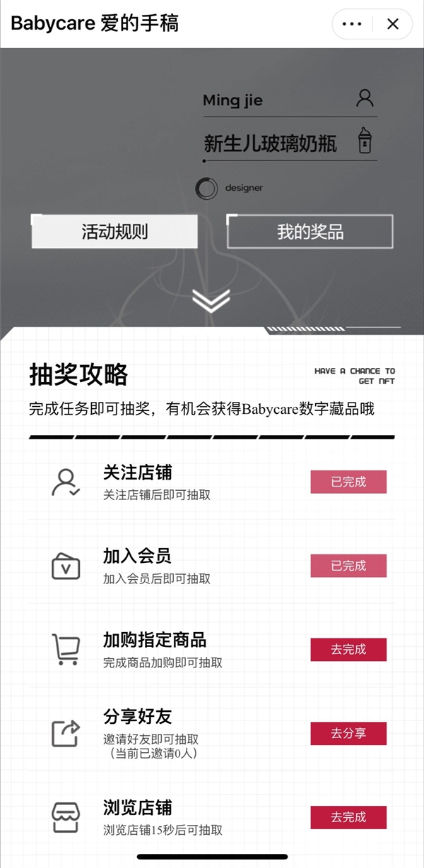 3月23日至31日,用户可以在手机淘宝搜索“数字藏品”进入天猫数字藏品频道,然后选择Babycare“爱的手稿”数字藏品,参与小程序互动,即可有机会获得500份随机款数字藏品。同时,还可以打开淘宝搜索Babycare天猫官方旗舰店,充值限定购物金即可获得随机款数字藏品(限量1500份,送完即止)。