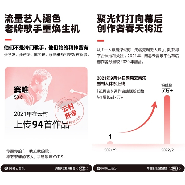 日前,网易云音乐还发布《华语乐坛趋势报告(2022)》,提出华语乐坛持续从精英化时代走向平民化时代,新生代原创音乐人商业价值提升,大量老牌实力歌手持续焕发生机,幕后音乐创作者受到更多关注和扶持。报告称,近3年,房东的猫作品在云村每年平均播放量超10亿次。
