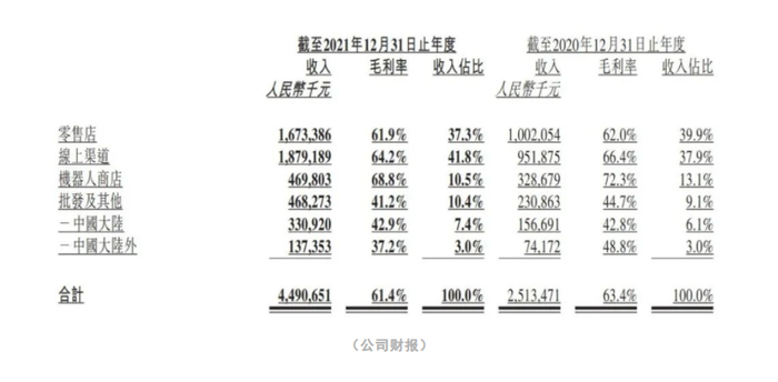 财报显示,根据渠道划分的收入,泡泡玛特的收入来自:1.零售店;2.机器人商店;3.在线渠道,包括天猫旗舰店、泡泡抽盒机及其他中国主流电商;4.批发渠道及其他,包括经销商及批量采购的公司客户,以及潮流玩具展等。