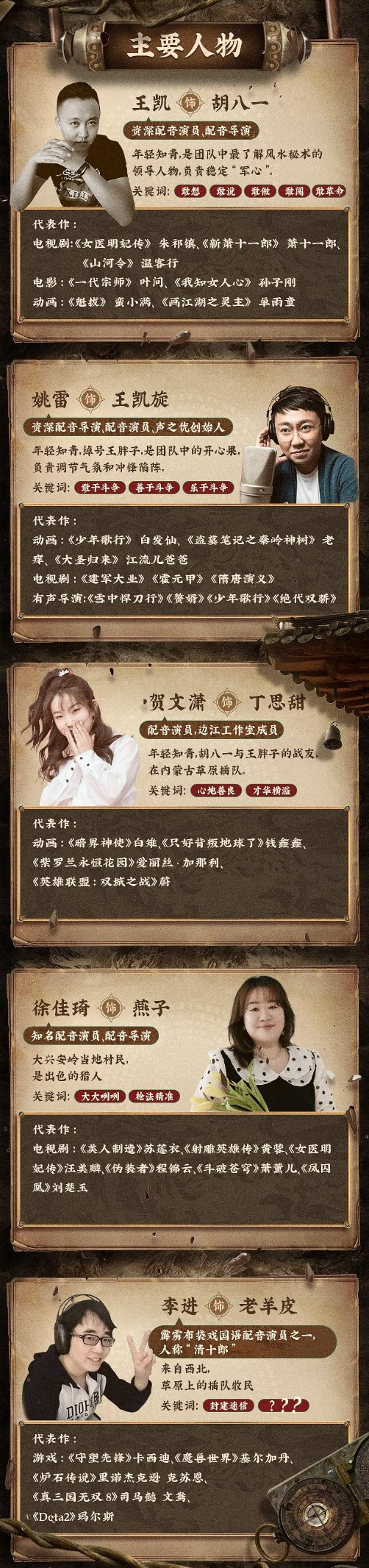 这次,众多配音名将齐聚《鬼吹灯Ⅱ·黄皮子坟》广播剧,他们的精彩演绎让听众的心跟随着广播剧中的故事起伏跌宕,仿佛身临其境。广播剧由知名配音演员郭浩然担任配音导演。代表作有《魔道祖师》、《大话西游》、《狐妖小红娘》、《琅琊榜之风起长林》等。毕业于北京电影学院配音班的知名配音演员、配音导演王凯则献声剧中灵魂角色“胡八一”,他曾为电视剧《新萧十一郎》萧十一郎、电影《一代宗师》叶问、广播剧《魔道祖师》蓝曦臣等众多知名角色配音,配音作品横跨影视动漫广播等领域,清脆百变的声音受到众多听众喜爱。剧中主角“王胖子”、“丁思甜”则分别由资深配音演员、配音导演姚雷、实力配音演员贺文潇演绎。