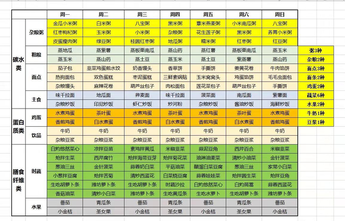 谷类: 以供应能量管饱为主,比如杂粮粥类、面点类……主要是碳水化合物含量丰富的粮谷类食物。