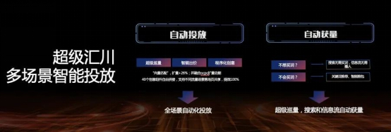 全场景智能提效主要从自动获量、智能出价、智能创意等方面帮助广告主实现一体化的自动投放。为了解决广告主买词难、圈人难、出价难的问题,全新升级的超级汇川投放平台特别推出了超级巡量,利用系统的数据自动探索大盘所有的人群,智能匹配广告主经营目标和用户意图,实时找出最适合广告主的人群进行投放,持续稳定自动获取流量。经测试期跑量,使用超级巡量的客户获量能力整体提升了26%。