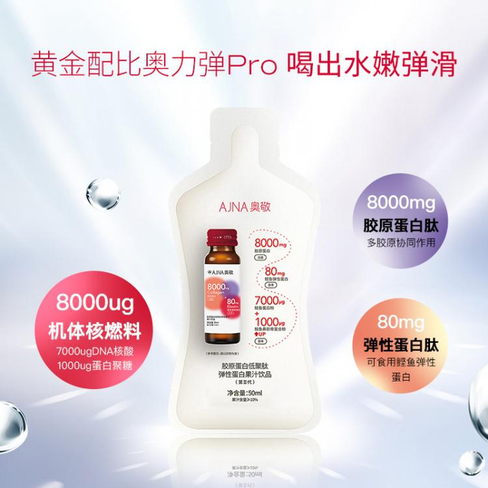 为此,升级版的奥敬胶原蛋白饮(第II代)在原来第I代的基础上,额外重磅添加了7000μg来自「鲑鱼白子」的DNA核酸,以及1000μg来自「鲑鱼鼻软骨」的蛋白聚糖。其中DNA核酸萃取自日本北海道DNA核酸含量最丰富的野生鲑鱼白子,含量远高于沙丁鱼,营养高且珍贵,一条鲑鱼仅约提取3mgDNA 核酸,它可以促进机体自身合成胶原蛋白,延缓胶原流失;蛋白聚糖又被称作海洋“美肌黄金”,平均每1600条鲑鱼的鼻软骨才能提取出1公斤的蛋白聚糖,它在皮肤中与胶原蛋白、透明质酸组成3D立体网状结构,共同赋予表皮水润柔韧性,同时促进新陈代谢。特殊的分子结构可赋予肌肤保水力,提升肌肤含水量,还能与EGF表皮生长因子结合,促进胶原蛋白和透明质酸的生成。