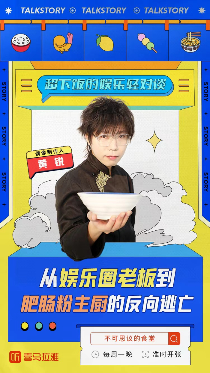 曾以制作人身份启动TF家族项目、推出偶像组合TFBOYS的黄锐,其播客节目《不可思议的食堂》已经上线。作为偶像制作人,黄锐邀请娱乐圈的朋友们做客聊天,分享美食与背后的故事,有八卦吐槽,也有治愈回忆。