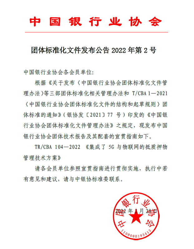 近日,中国银行业协会发布了TR/CBA 104—2022《集成了5G与物联网的抵质押物管理技术方案》。该标准化文件由光大银行牵头提出,中国信息通信研究院提供了技术方案并担任联合主笔,工商银行、农业银行、民生银行、浦发银行、江苏银行等银行机构以及通信业众多单位积极参与。该文件是首个5G+物联网智能金融应用领域的标准化文件,对推动5G+物联网智能金融应用具有重要的标志性意义,代表了5G时代智慧金融应用的最前沿研究成果。