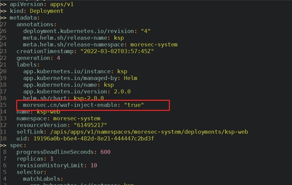 尚付CNPP为云原生微服务提供了声明式的原生WAF能力。部署应用时,只需要添加moresec.cn/waf-inject-enable:”true”标签,该应用启动时即自动获得了WAF保护,安全保护成为了一个需要即可获得的资源,简单而强壮。