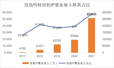 2015年还在按照杂货铺模式经营的泡泡玛特发现,日本的Sonny Angel小娃娃很好卖,在经过市场调研后发现,大家还很喜欢“Molly娃娃”。如果按照过去一些不良企业的做派,大概率会直接盗版。可是泡泡玛特选择找到Molly的设计师,取得经销权和生产权,签署独家合同后才推向市场。产品迅速取得成功,企业也扭亏为盈。泡泡玛特随后开始签约了一大批艺术家,这才有了后面的 LABUBU、PUCKY、DIMOO、BOBO&COCO 等更多产品面世。2021年潮玩盲盒热门IP前十大中泡泡玛特占据七个,前五大中泡泡玛特占据四个。自有IP的营业收入从2017年的4102万飙升到2021年的25.87亿,自有IP营业收入占比从25.9%上涨到57.6%。这样的增幅是非常惊人的。
