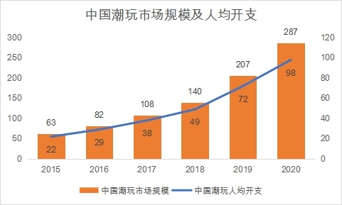 艾媒数据显示,全球潮流玩具零售市场规模已由自 2015 年的 87 亿美元增长至 2021年的 299亿美元。我国潮流玩具也迎来了黄金发展期,中国潮玩市场规模从2015到2020年增长了356%,同期世界潮玩规模增长了172%。中国人均潮玩开支从22元增加到98元。